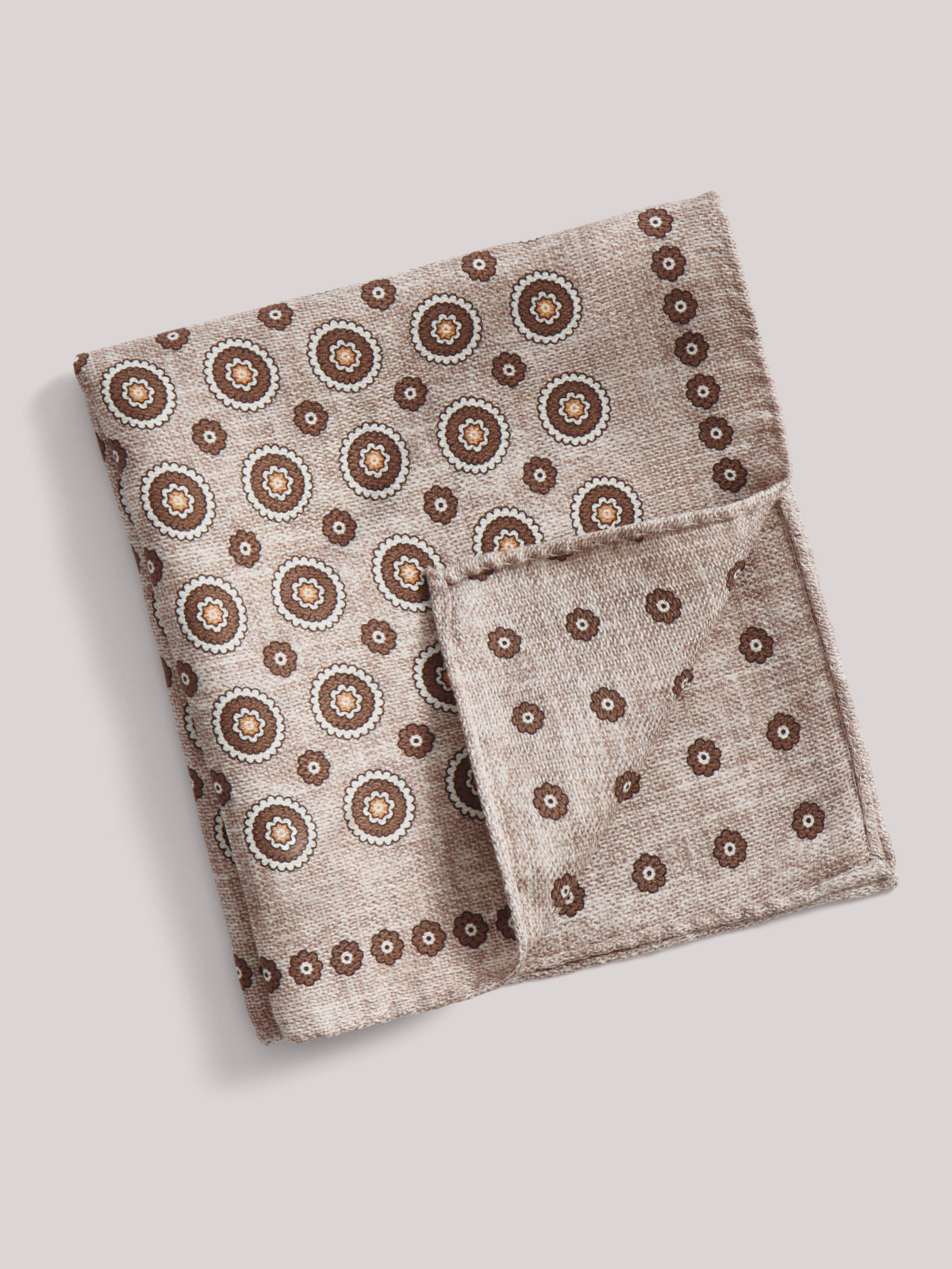 Квадратный нагрудный платок с разноцветным набивным принтом с одной стороны и однотонный с другой выполнили из шелкового твила.Бежевый цвет с принтом в коричневый цветок