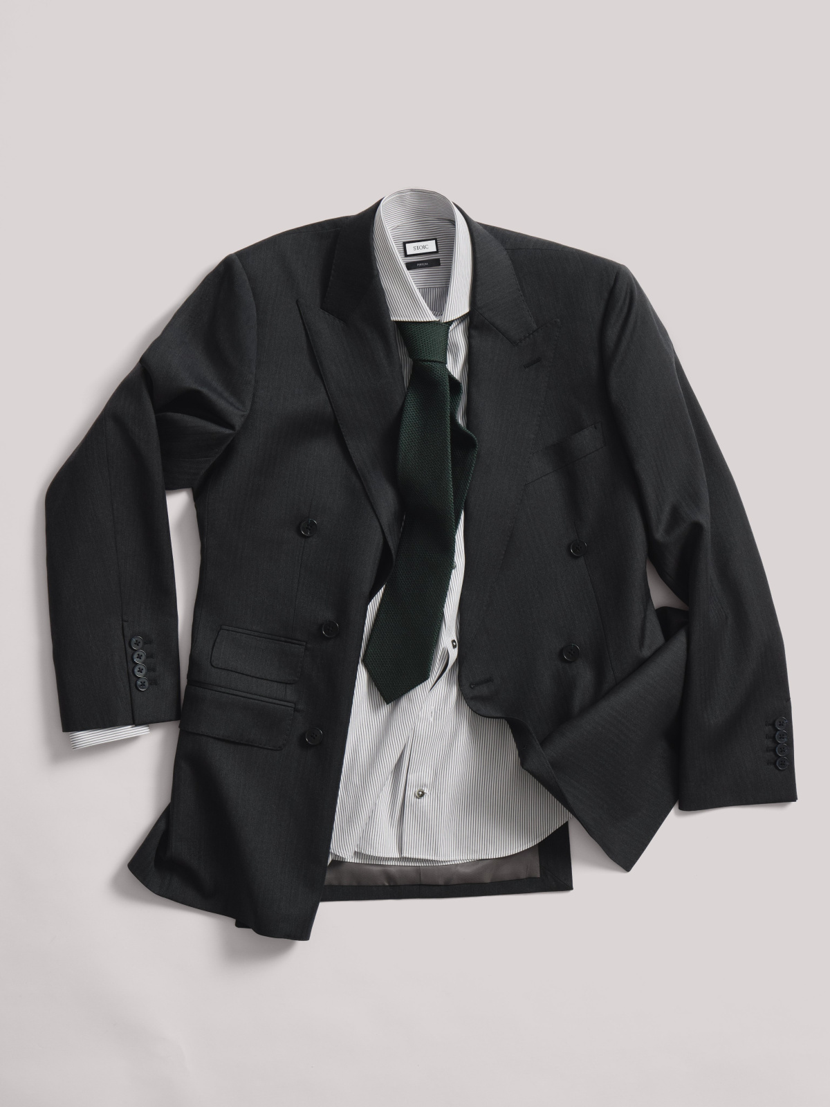 Детали пиджака: двубортный на шести пуговицах, широкий лацкан-заостренный, боковые карманы прямые с клапаном, манжет рукава с рабочими петлями, 2 шлица,